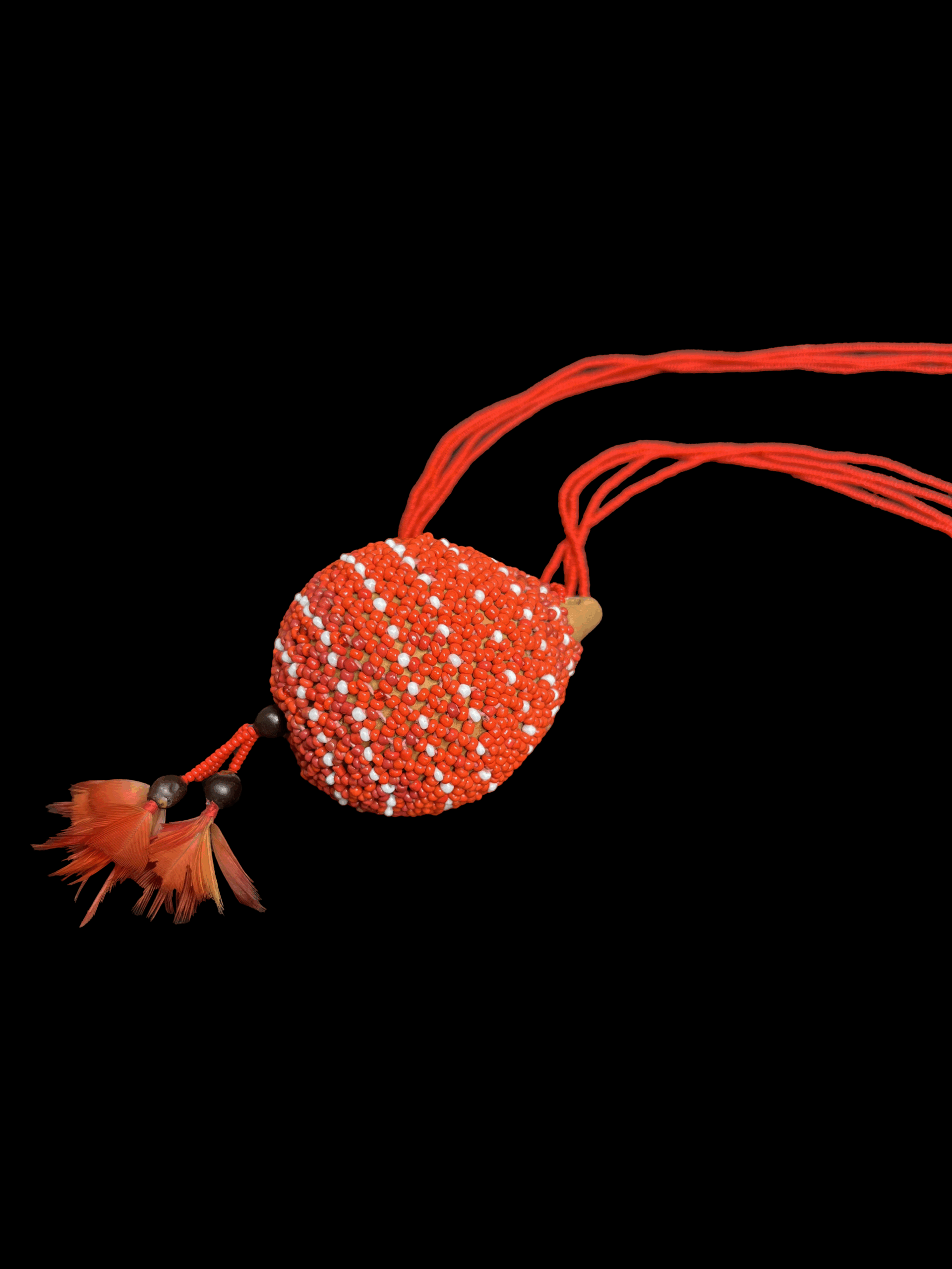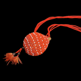 O colar é feito de miçangas na cor vermelho é produzido por várias voltas de miçangas e a cabaça é revertida por miçangas nas cores vermelho e branco e o fundo da cabaça possui algumas penas de Arara na cor vermelho