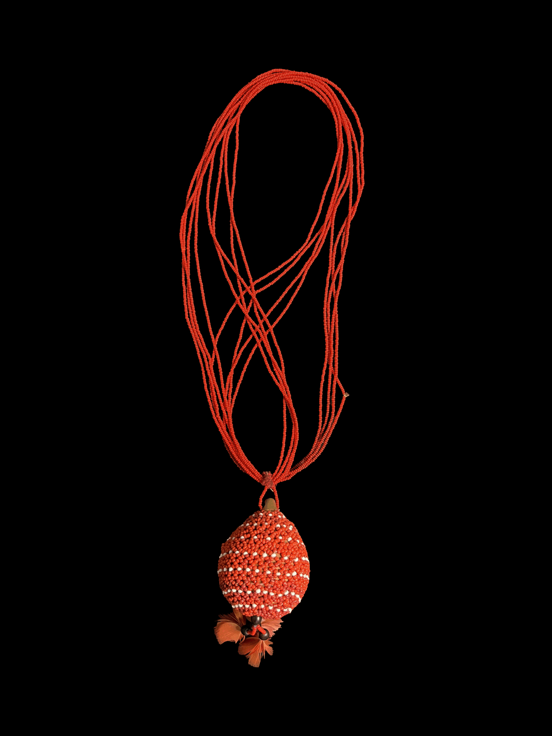 confeccionado com miçangas vermelho e brancas alinhada em em vários fios formanto um formato alongado.